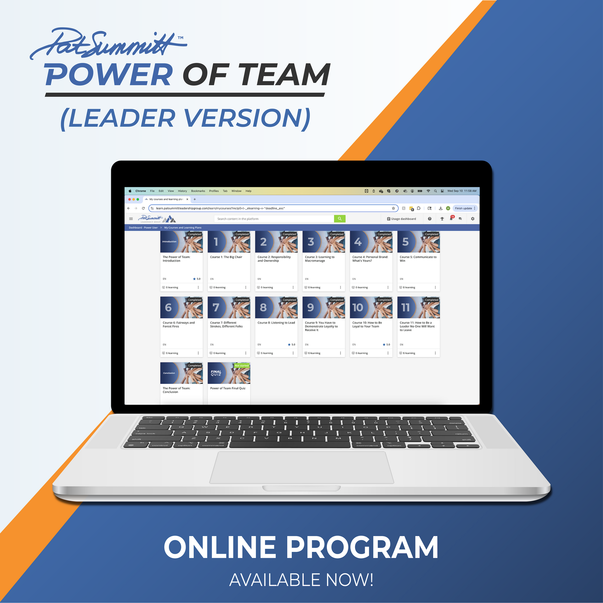 Lead with confidence and transform your team. Built on Coach Pat Summitt’s legendary leadership principles, this online program equips leaders with the tools to inspire accountability, build trust, and create lasting team success.